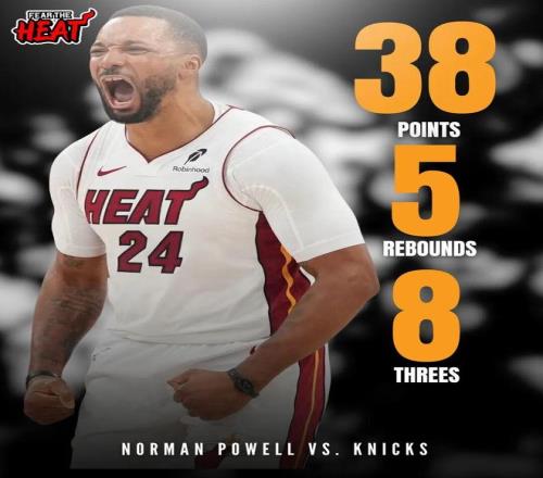 拿上一场比赛来说,热火主场125-106大胜鹈鹕,鲍威尔全场只打了不到29分钟,投篮15中11,三分12中9,罚球4中3,得到34分3篮板3助攻2抢断。