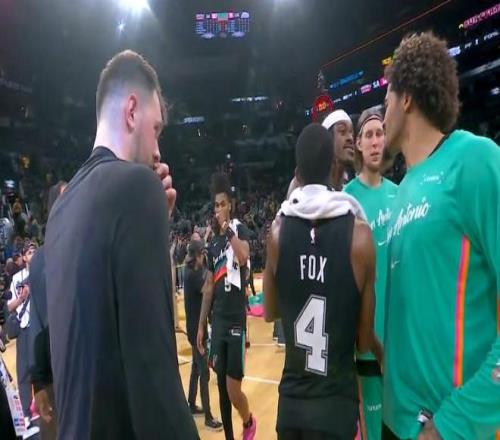即便终场哨声早已吹响,湖人和马刺两队在弗罗斯特银行中心球馆的火药味仍未消散。本场比赛湖人以91-107不敌马刺,三连胜的势头被终结。当两队球员陆续离场时,湖人前锋范德比尔特与马刺前锋索汉发生口角争执,随后范德比尔特伸手戳向索汉的面部,这一举动立刻引发马刺前锋朱利安・尚帕尼的不满,后者直接上前将范德比尔特推开,双方球员险些因此爆发大规模斗殴。