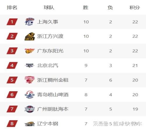 四冠王辽宁队,上一轮比赛他们排在积分榜第7名,不过,随着浙江队和广州队先后赢球,辽宁队的排名也下滑到积分榜第8,目前,他们的战绩是7胜5负。排在积分榜第9名的是山西队,他们目前的战绩是7胜5负,和辽宁队一样。而积分榜第10名则属于宁波队,他们的战绩也是7胜5负。第11名则属于深圳队,战绩为6胜6负。至于季后赛守门员位置,则属于吉林队,他们目前的战绩也是6胜6负,胜率刚过半。