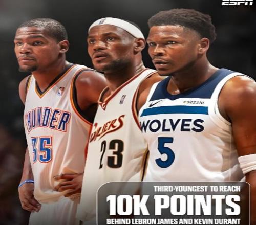 詹姆斯在23岁59天时得到10000分,杜兰特则是在24岁33天,科比是24岁194天;至于爱德华兹,在对骑士的比赛中得到他第23分时,以24岁156天扣开10000 分,比科比快了38天。